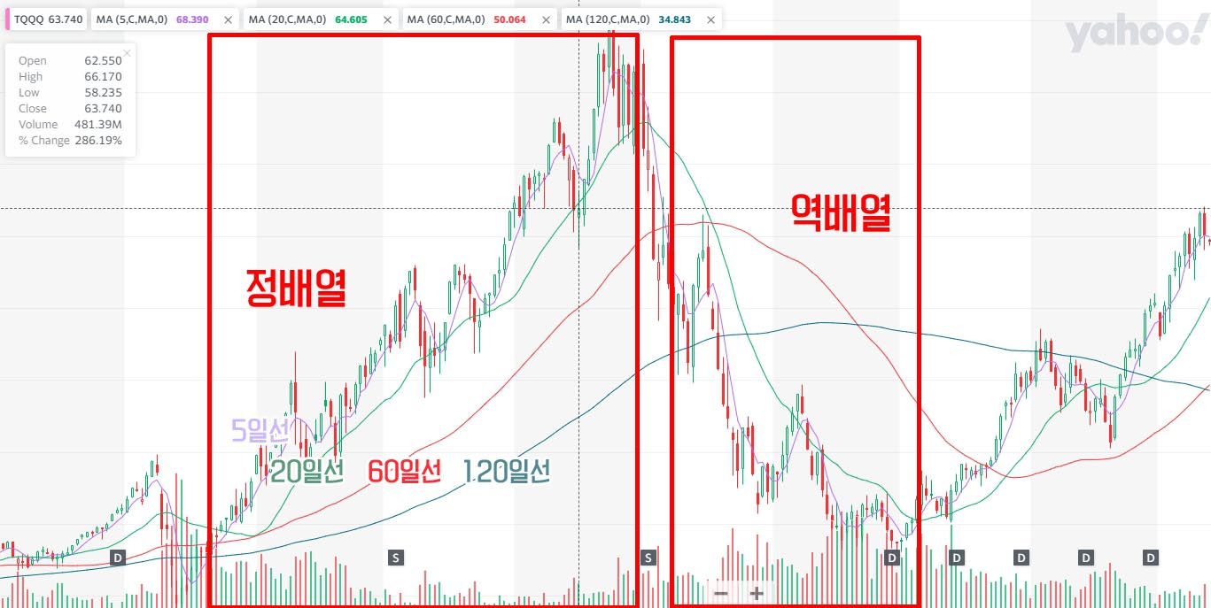 위에서부터 5일선 → 20일선 → 60일선 → 120일선 순서이면 정배열